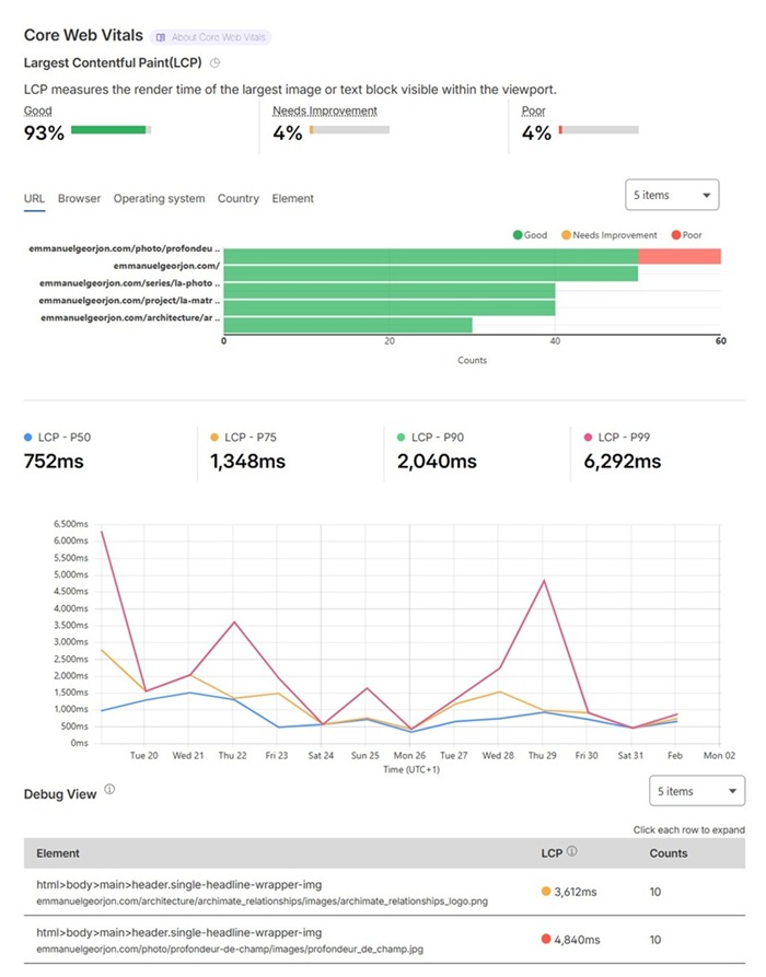 L’indicateur CLS est particulièrement intéressant : il montre l’écart entre le chargement du contenu, et l’application de la mise en forme, ce que nous ne voyons pas forcément lorsque nous faisons des tests « en local ».
