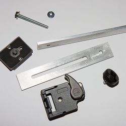 Le principe est d’utiliser le même plateau que celui de la rotule. Dans mon cas, il s’agit d’un Manfrotto RC2. Pour le reste, j’ai longtemps cherché un système qui m’évite de faire usiner les pièces. Malheureusement, je n’ai rien trouvé de réellement satisfaisant.